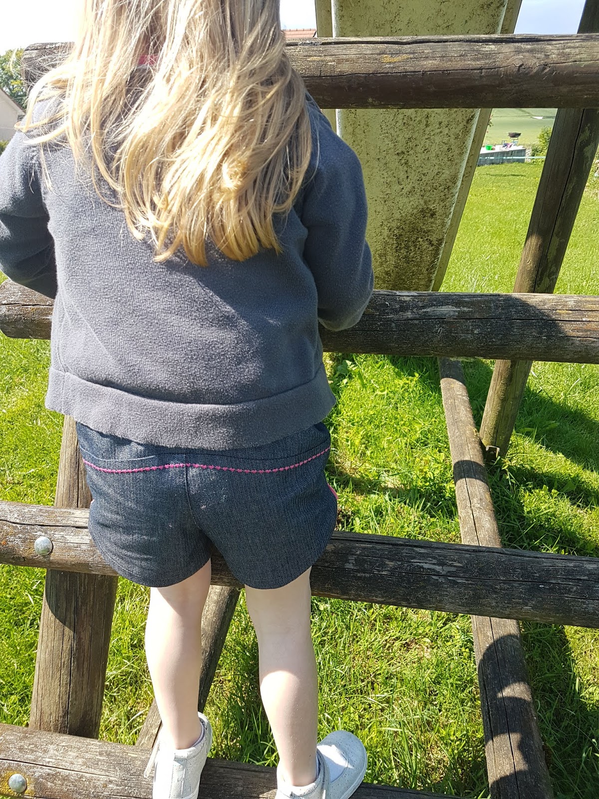 Cahier des charges un peu complexe : il faut que ce soit suffisamment ajusté au niveau du bassin pour ne rien dévoiler (pas de sous-vêtements ...), mais pas trop pour permettre tous les mouvements sans inconfort. Et bien sur une élasticité maximale, elle l'enfile en tirant dessus de tous les côtés et les coutures sont très sollicitées. Et puis, tant qu'à faire, que ce soit rose et que ça brille !